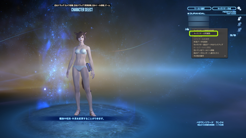 ログイン画面のキャラクター名を右クリック(パッドなら□ボタン)で「キャラクターの再編集」を選びます。