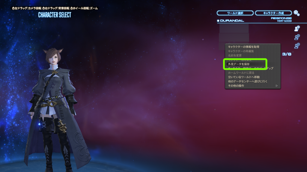 キャラクター名を右クリック(パッドなら□ボタン)で『外見データの保存』を行いましょう。
