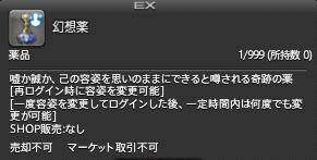 と書かれている通り、プレイヤーキャラクターの見た目を顔立ちから性別、果ては種族まで変えられる、早い話がキャラメイクのやり直しができるアイテム。