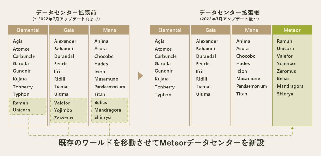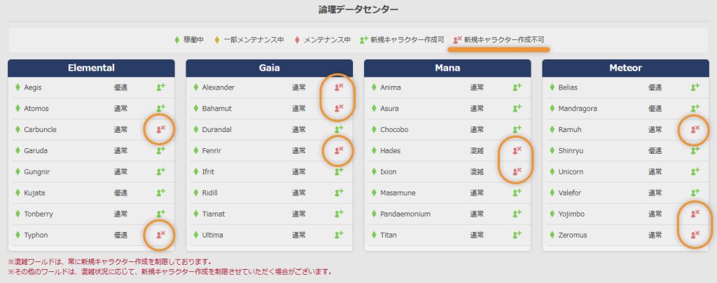 日本で遊ぶ場合、データセンターは基本的に「Elemental」「Gaia」「Mana」「Meteor」の4つから選ぶことになるので、それらの構造を以下の表にまとめてみました。