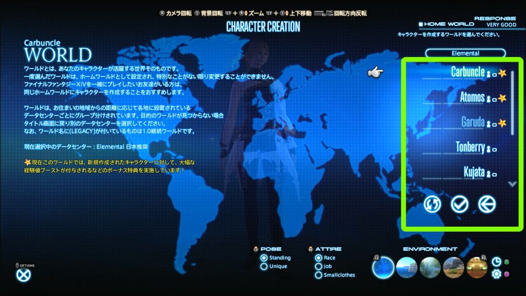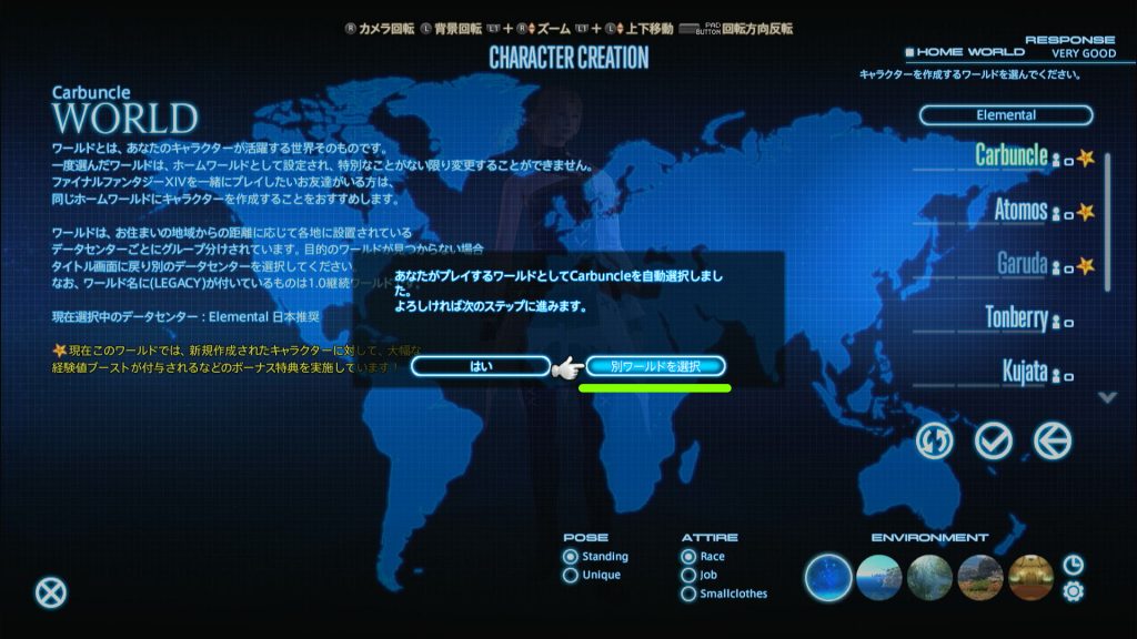 FF14を始める時(キャラクターを新規作成する時)に、この『ホームワールド』を選択する必要があります。
