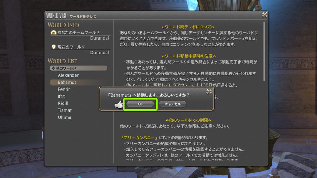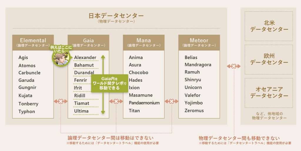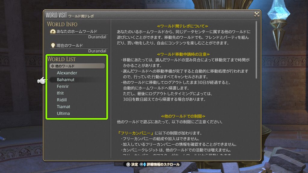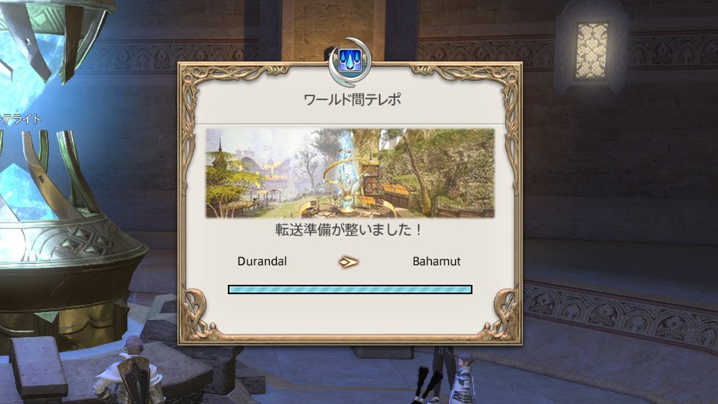 「ワールド間テレポ」とは、現在プレイしているキャラクターがいる論理データセンター内の他のワールドへ、一時的に移動できる機能です。